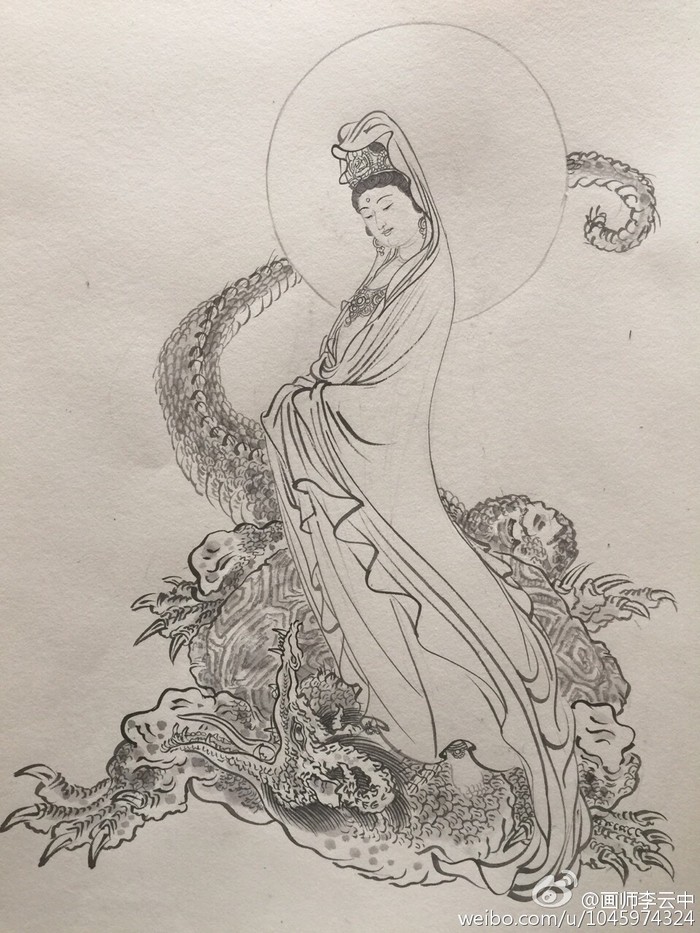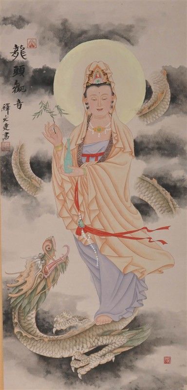 龙头观音,乘龙显圣于祥云中,龙头观音因驾乘龙头,故称龙头观音。相当于经文:“应以天龙、夜叉(中略)等身得度者,即皆现之而为说法”之观音化身。盖以龙为兽中之王,比喻观音之威神,一般流布之像皆为跏坐或站立于龙头上。慈悲主十二大愿深似海,佛神百千变度得无边苦。